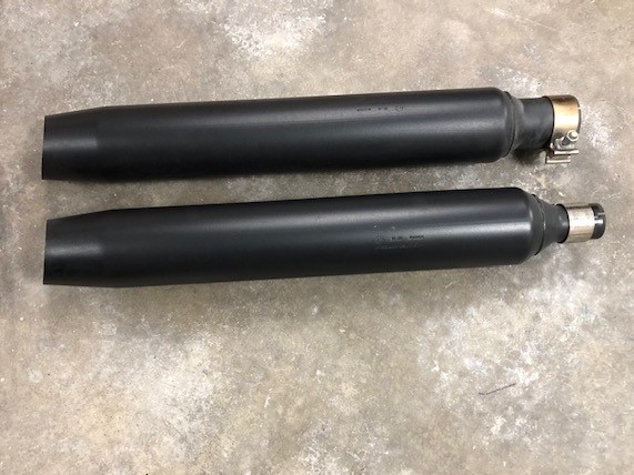 Uitlaatdempers Harley-Davidson Touring M8 zwart origineel. Z.g.a.n. Past o.a. op de Street Glide, Road King Special en Road Glide (2017-up). OEM Parts Nrs 64900769 / 64900770.